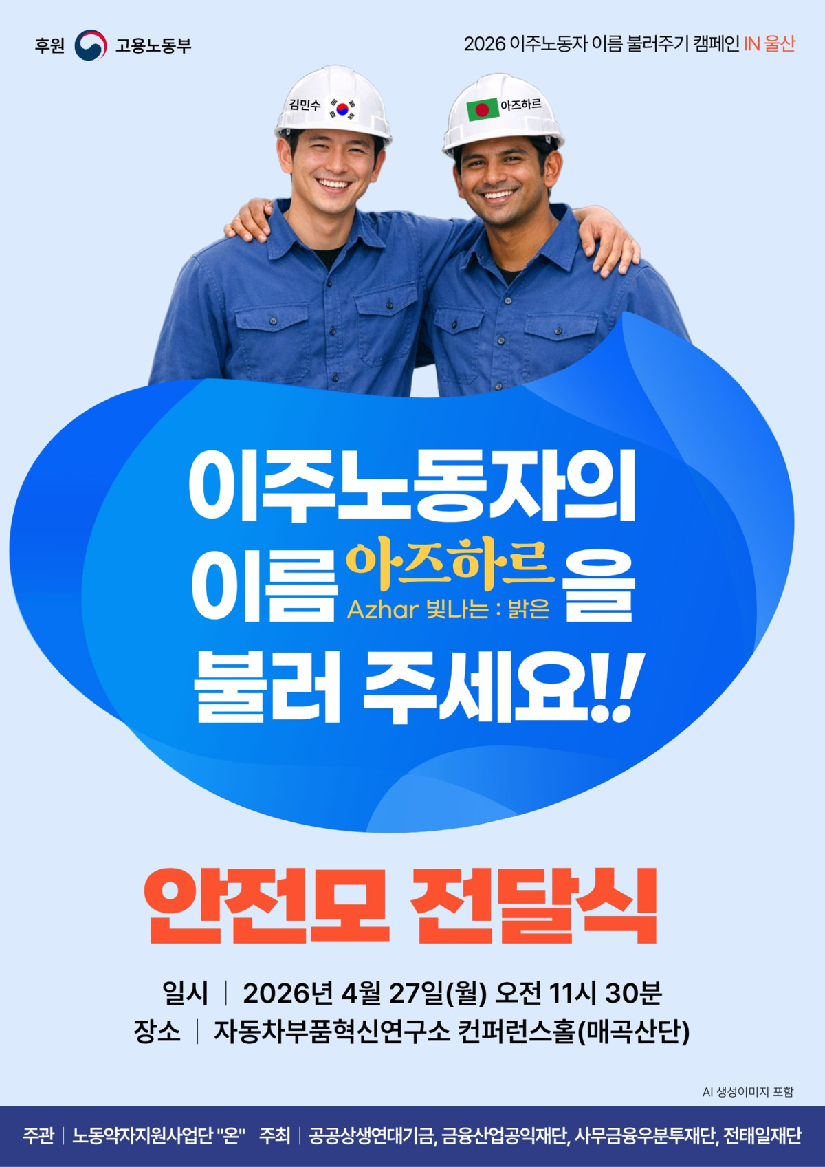 27일 관련 업계에 따르면 공공상생연대기금, 금융산업공익재단, 사무금융우분투재단, 전태일재단 등 4개 노동권익재단은 앞서 4월 17일 고용노동부와 업무협약을 맺고 총 1억 원의 기금을 조성해 ‘2026 이주노동자 이름 불러주기 캠페인’을 전개하기로 했다.