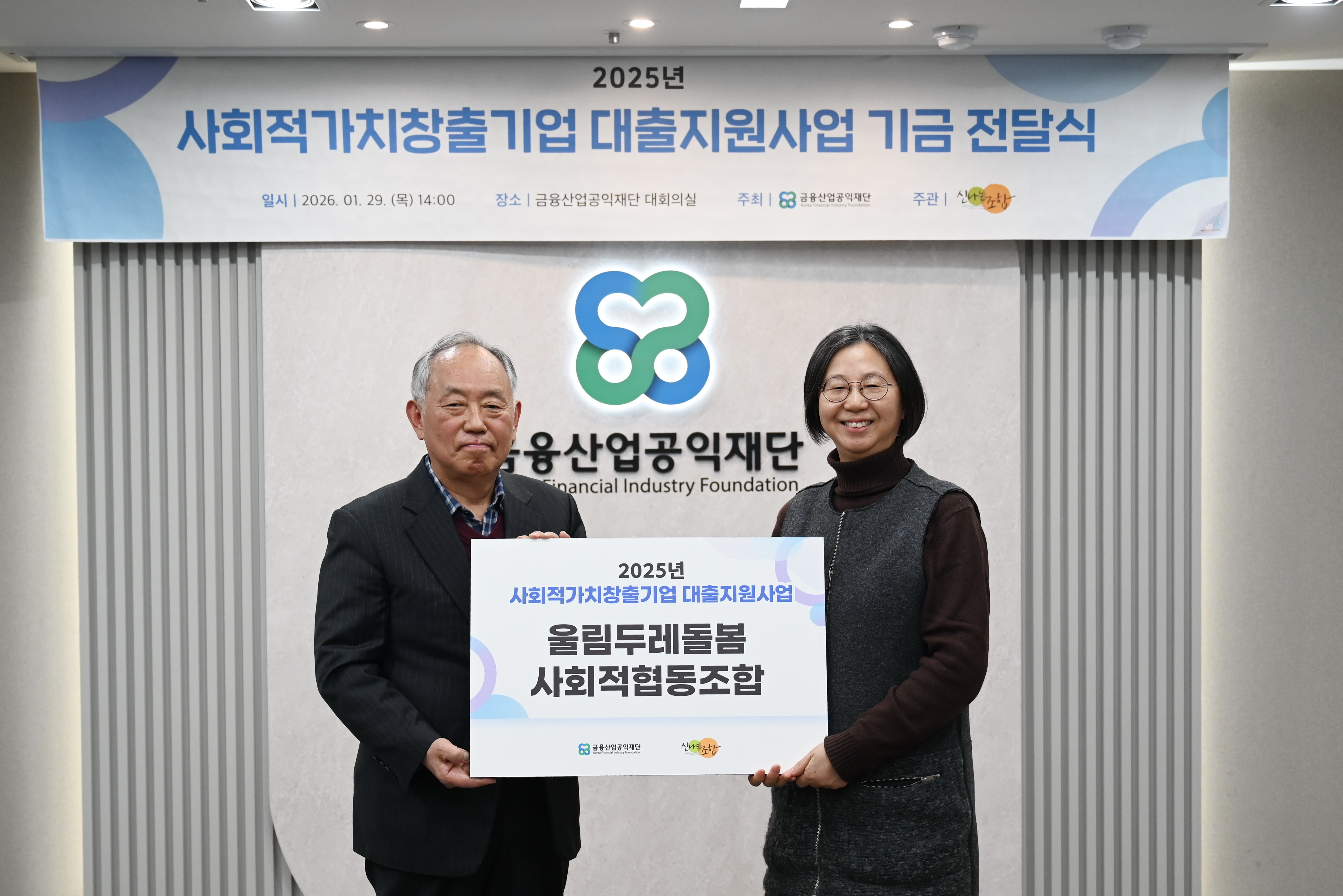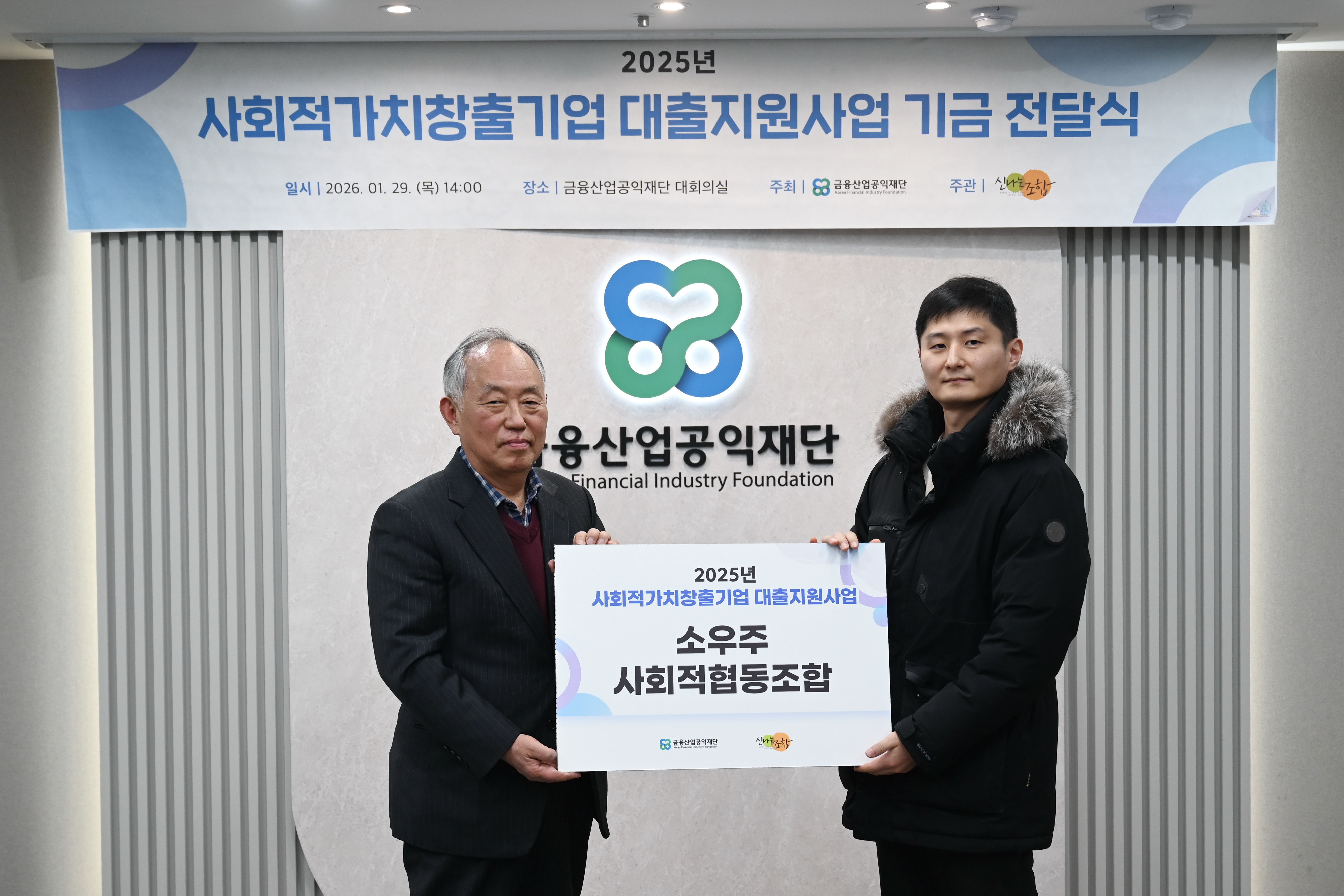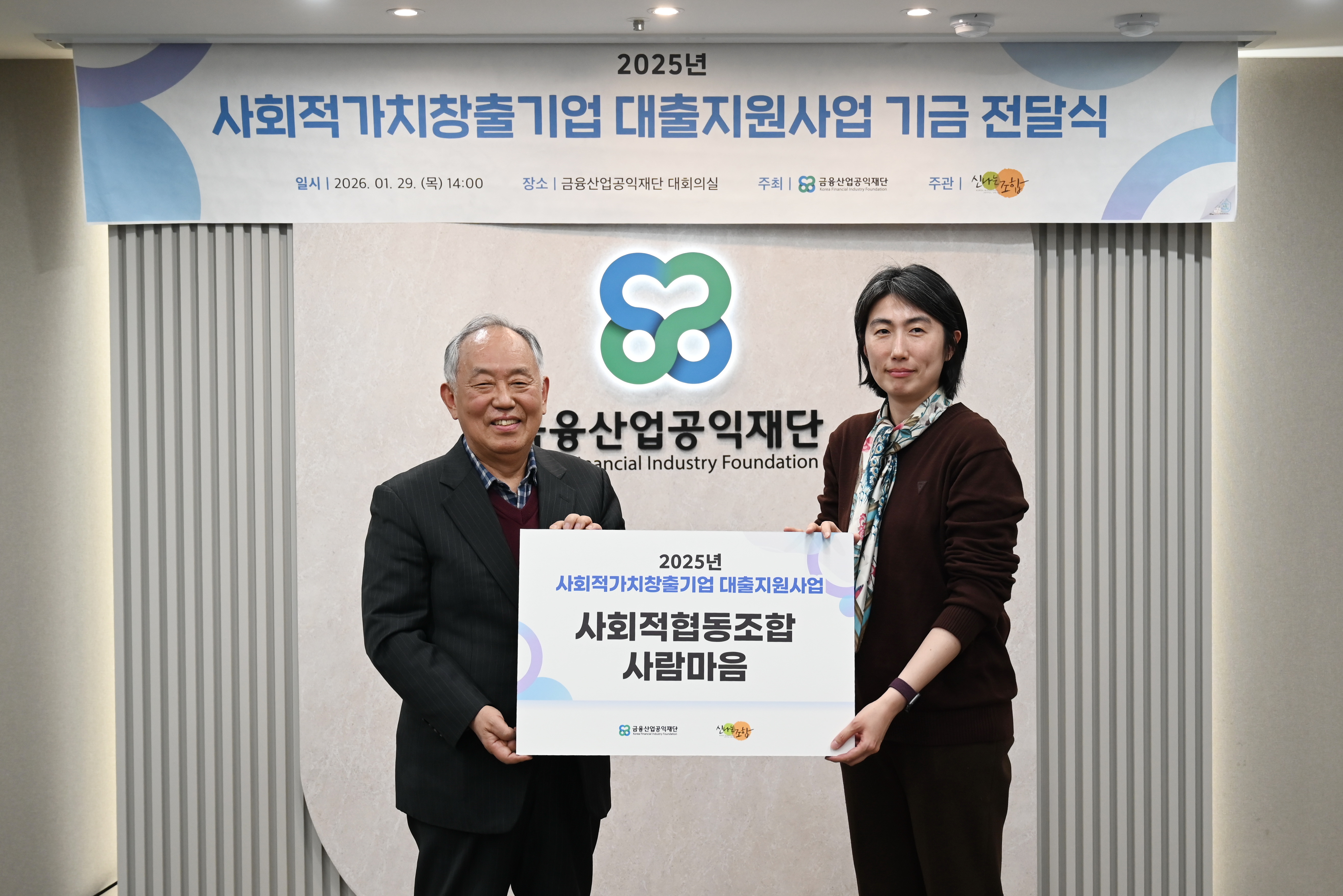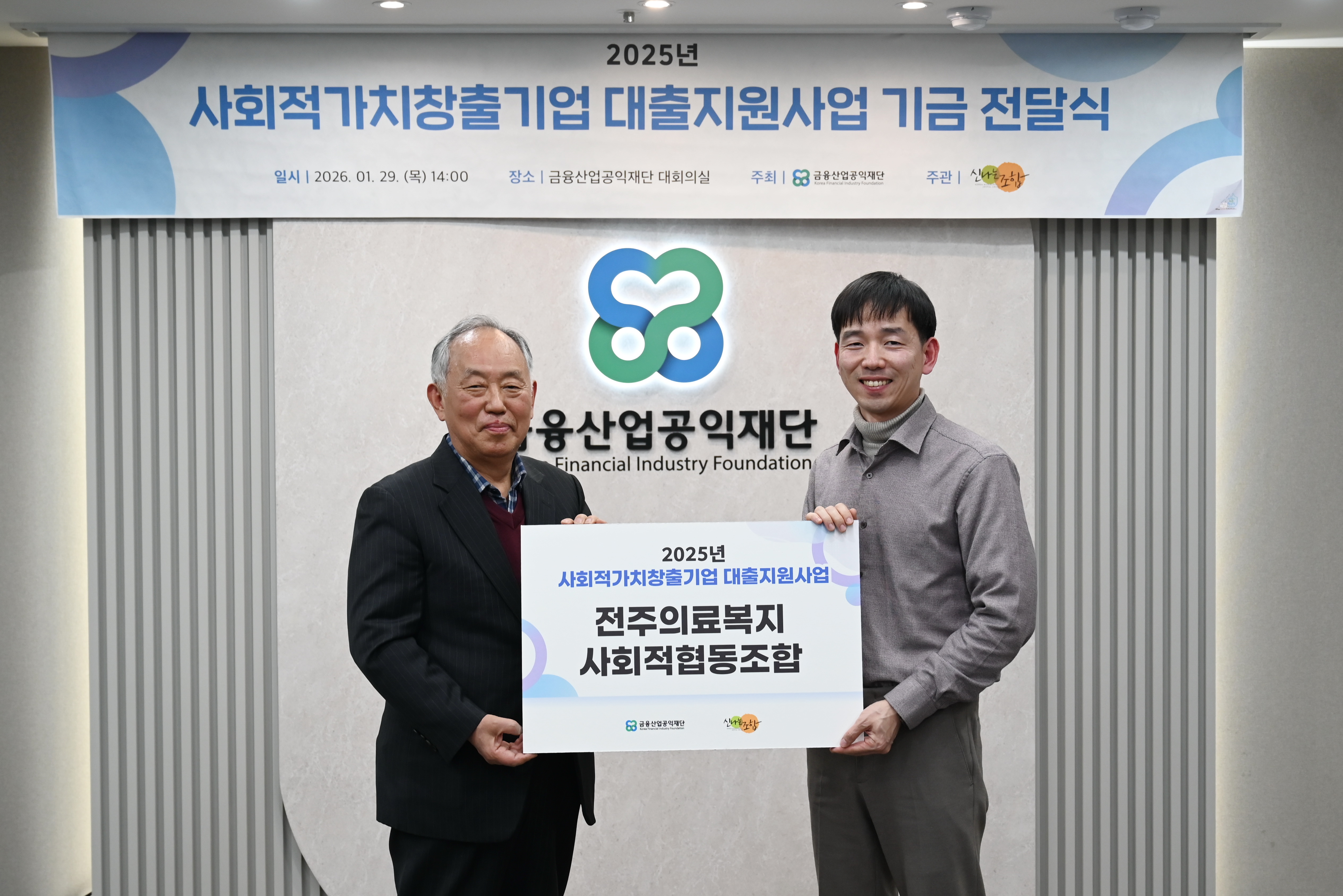금융산업공익재단이 1월29일(목) 재단 대회의실에서 신나는조합과 함께 '사회적가치 창출 기업 대출지원사업 기금 전달식’을 진행하였다.