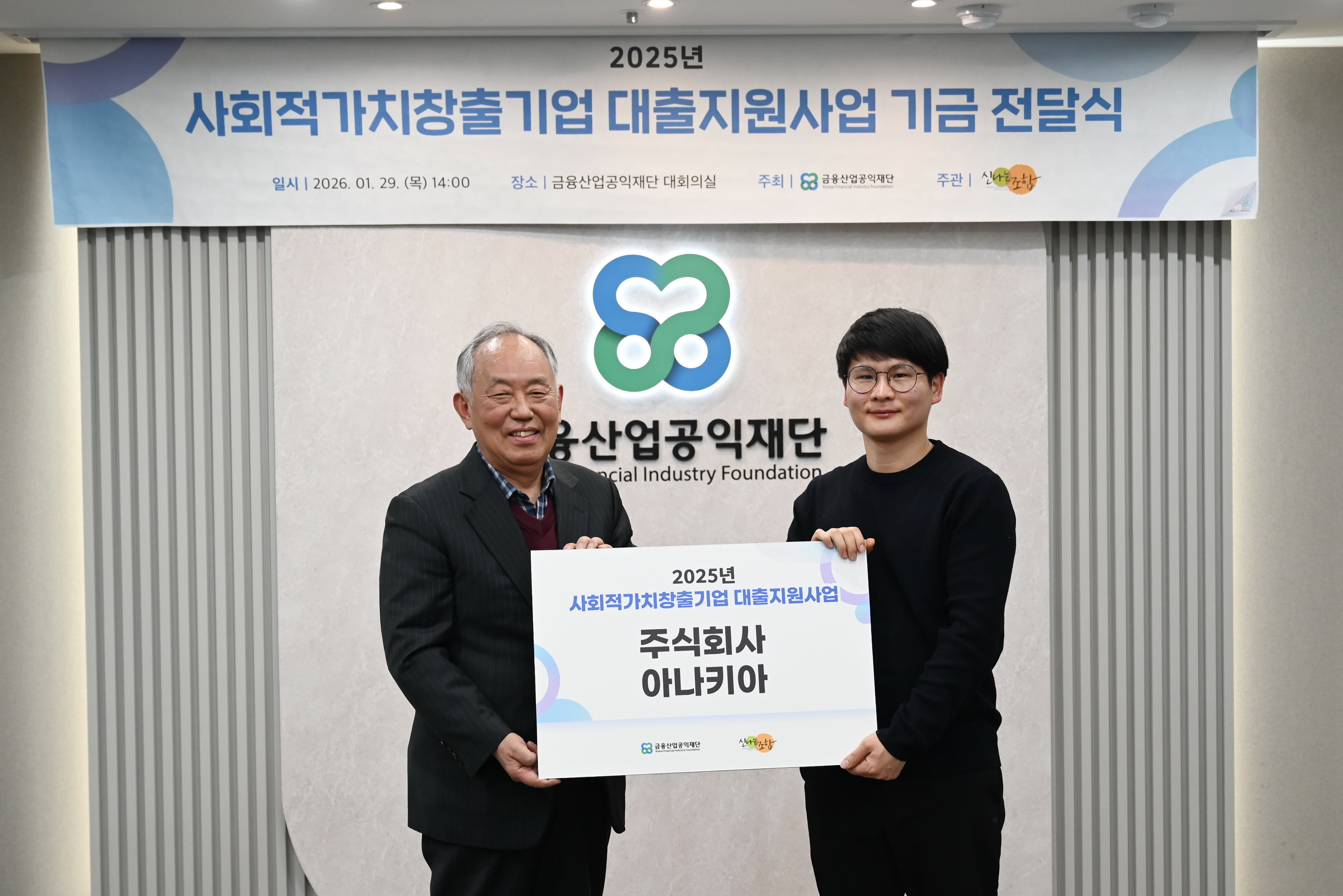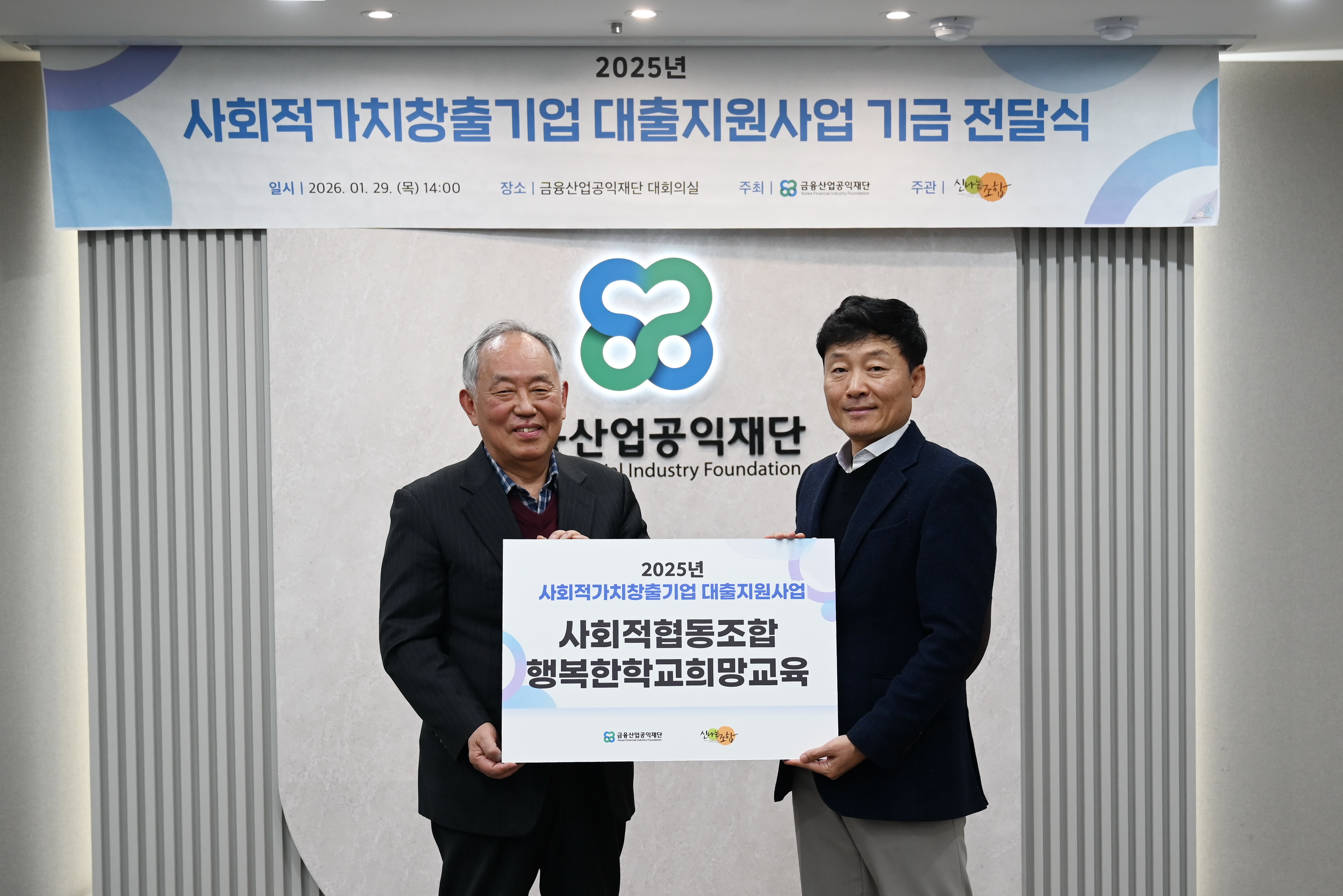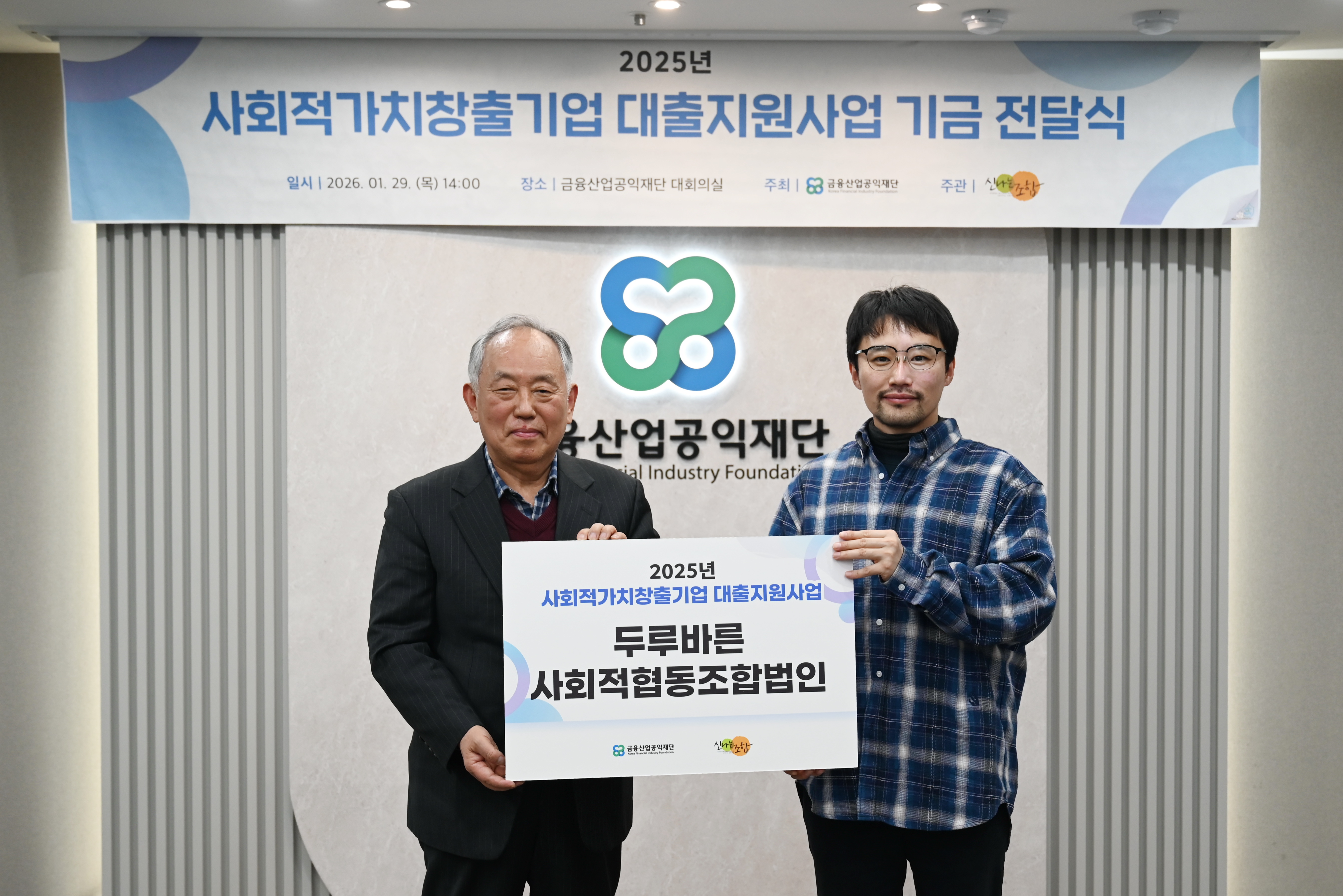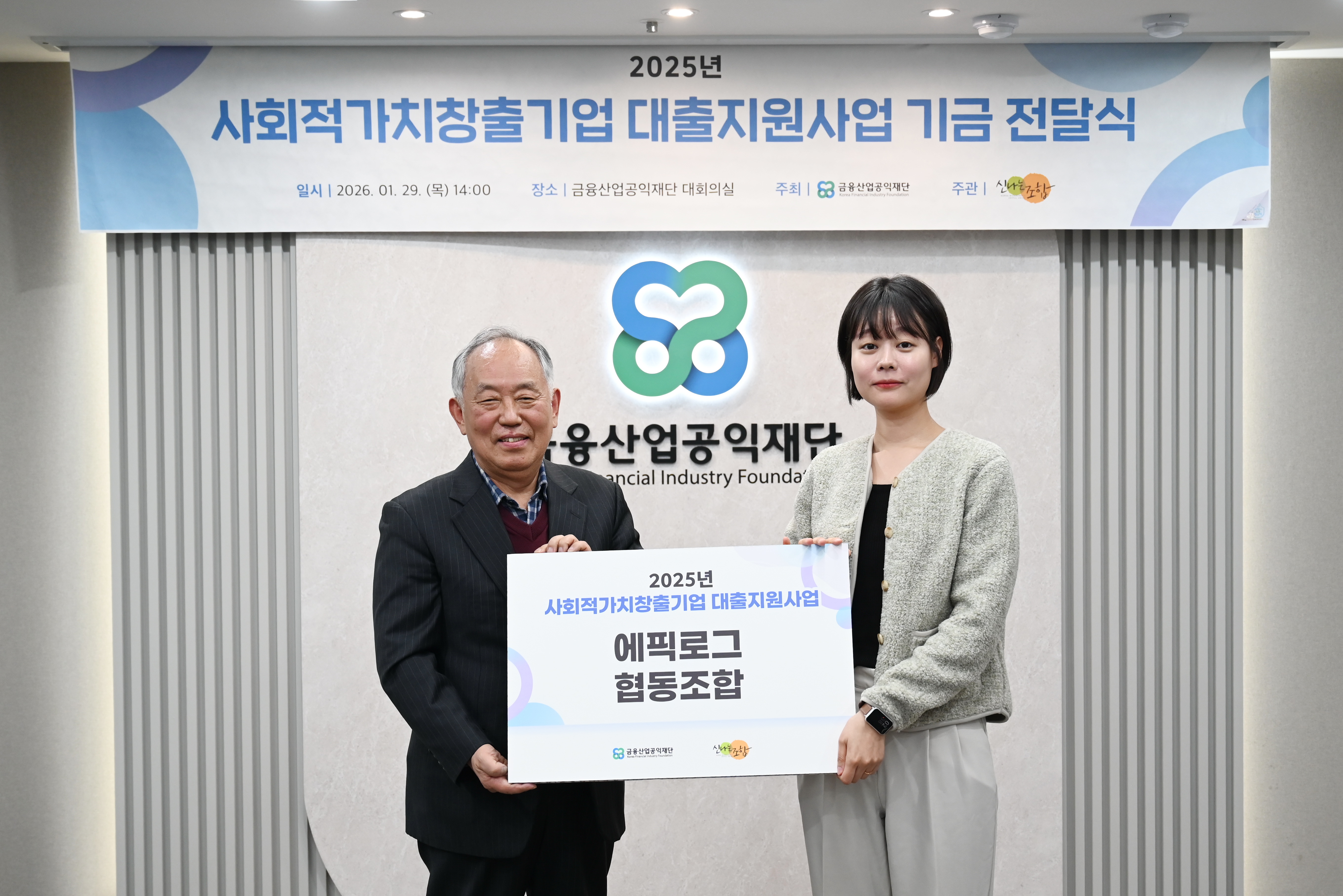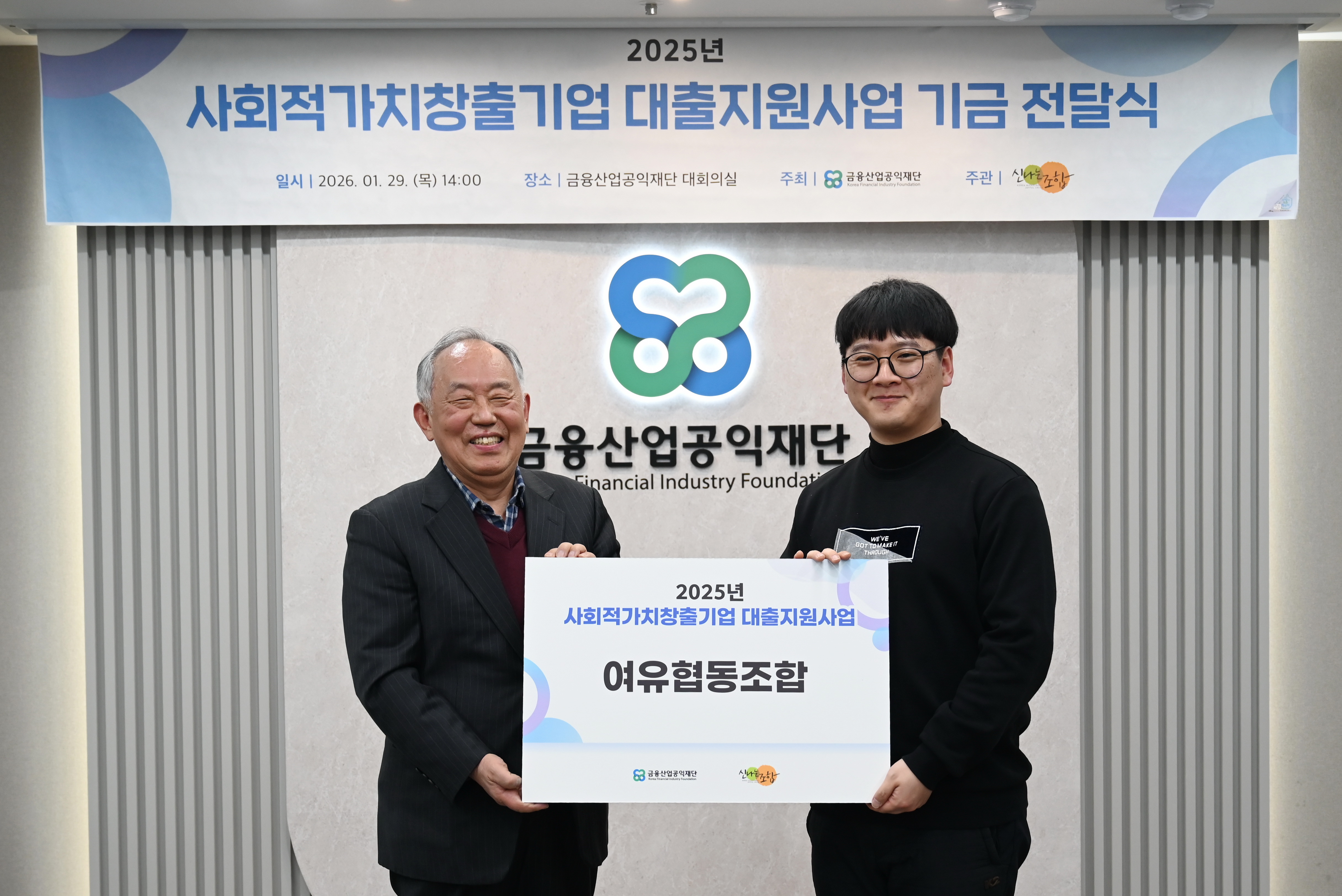금융산업공익재단이 1월29일(목) 재단 대회의실에서 신나는조합과 함께 '사회적가치 창출 기업 대출지원사업 기금 전달식’을 진행하였다.