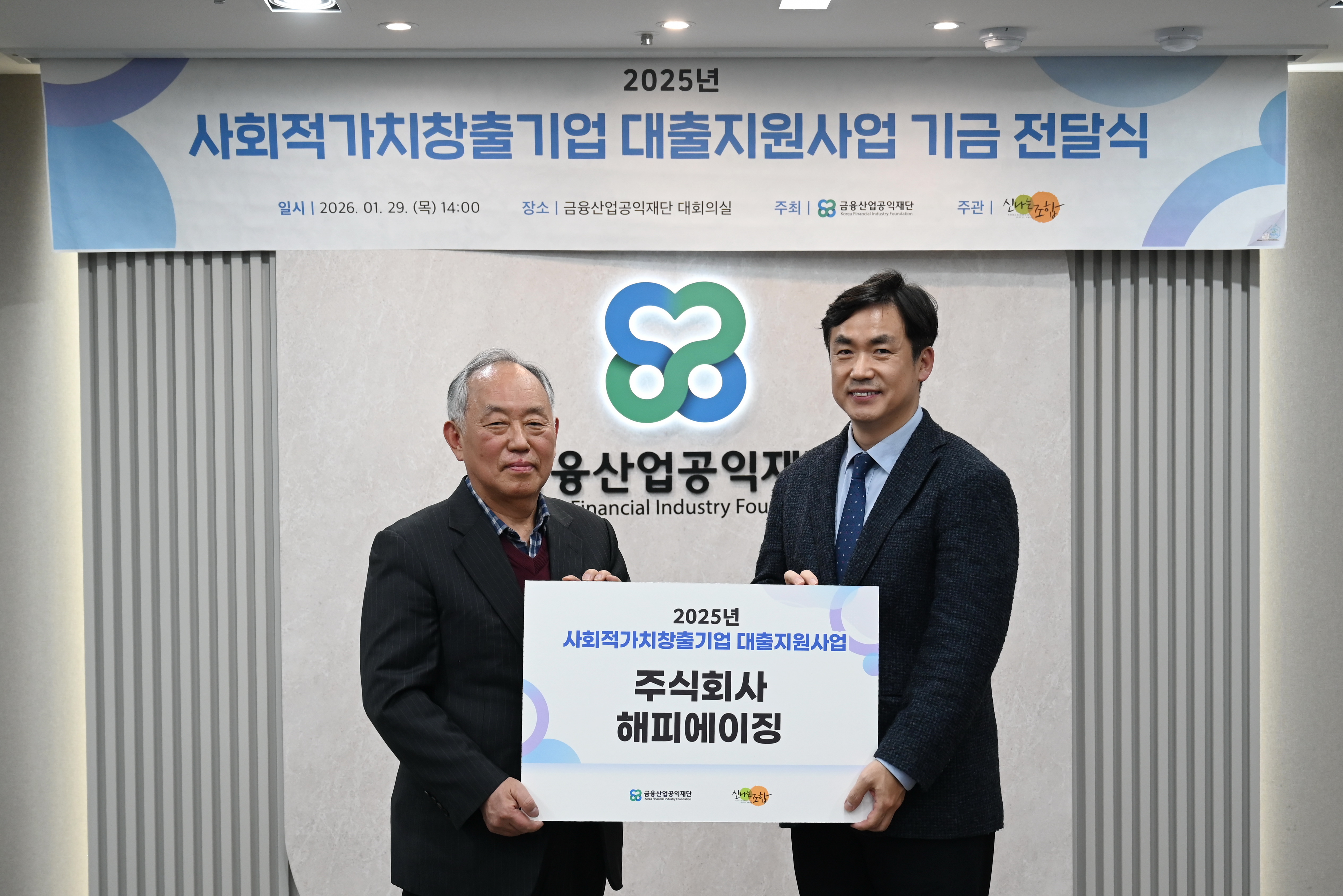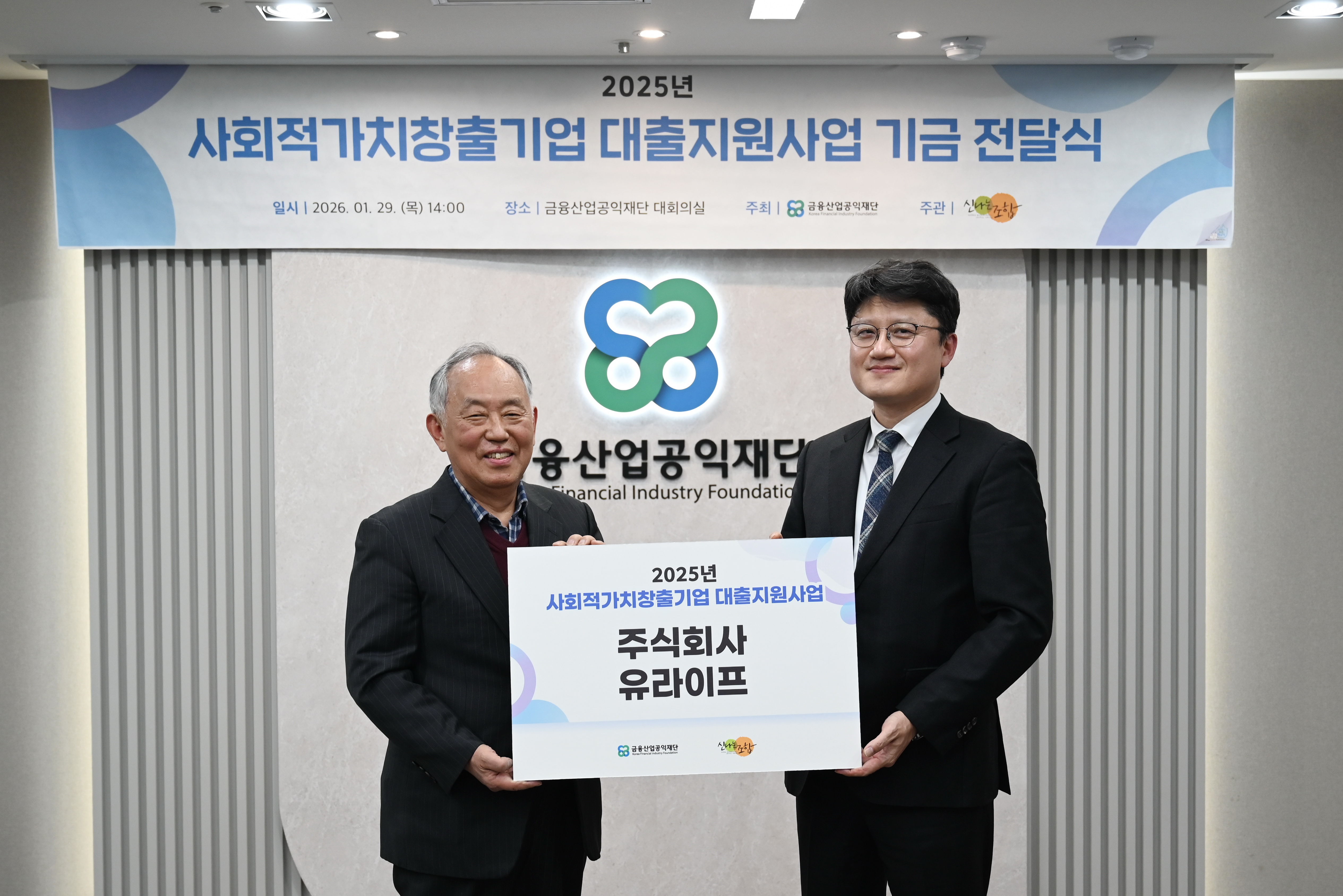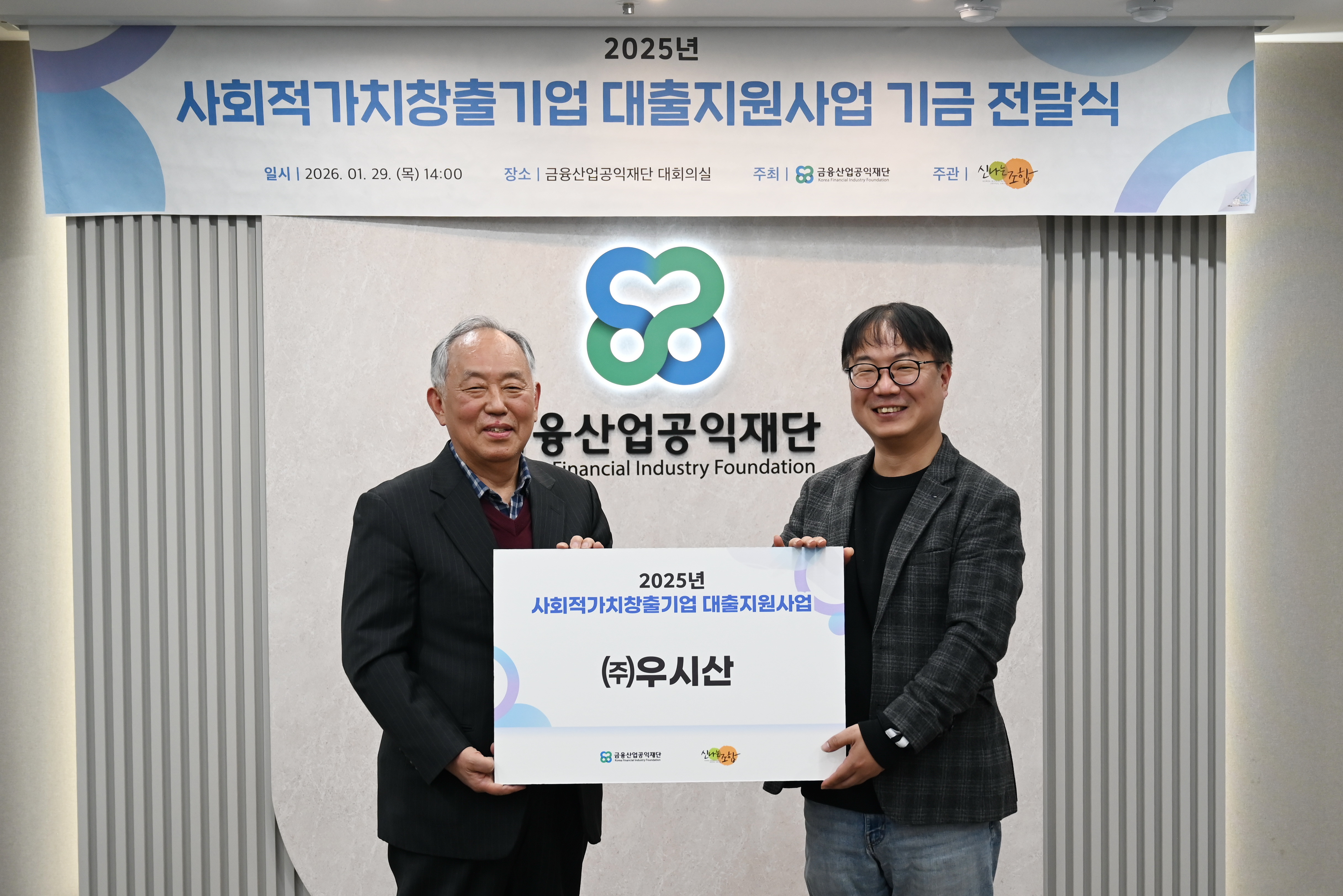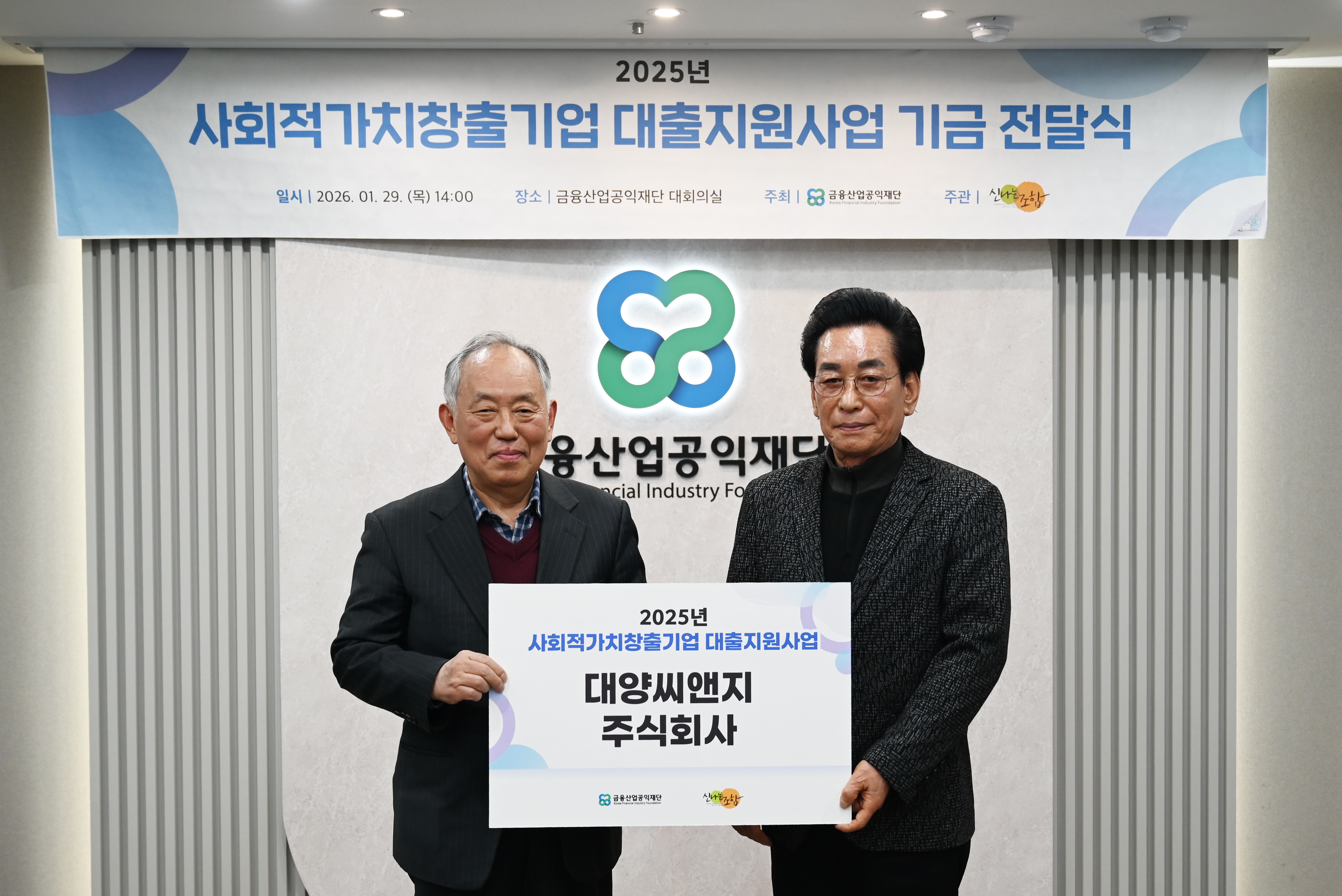 금융산업공익재단이 1월29일(목) 재단 대회의실에서 신나는조합과 함께 '사회적가치 창출 기업 대출지원사업 기금 전달식’을 진행하였다.